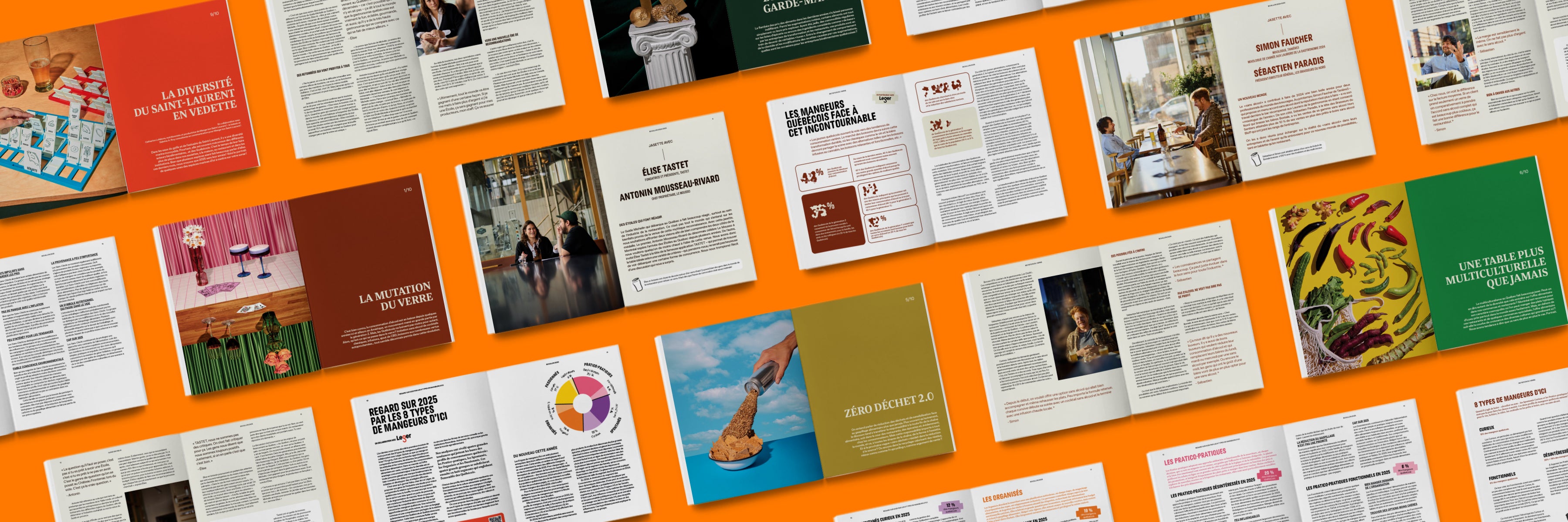 Dix dossiers présentant les sujets qui sont à mettre sur votre radar en 2025 commentés par plus de 50 experts de tous les domaines : gestionnaires, producteurs, transformateurs, restaurateurs, universitaires, influenceurs. De la mutation qui s’opère dans le verre des Québécois jusqu’aux espèces du Saint-Laurent qui seront en vedette, en passant par l’inévitable arrivée du “front-of-pack” et du Guide Michelin, la déshumanisation de notre relation à la bouffe qu’amène l’IA ou encore la nouvelle ère du zéro déchet… on en couvre large.